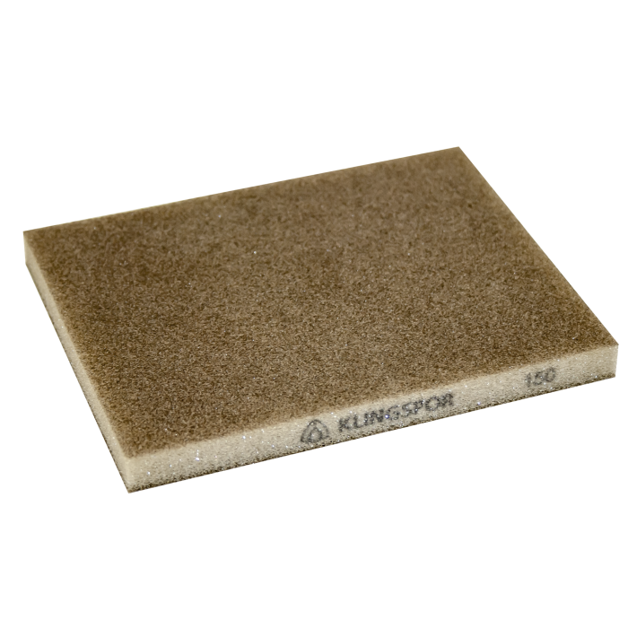 Sanding sponge. Provides a satin-matte finish of the sanded surface. Suitable for processing both lightly and heavily profiled surfaces (double-sided use). The product is resistant to creasing and cracking. Washable and reusable.