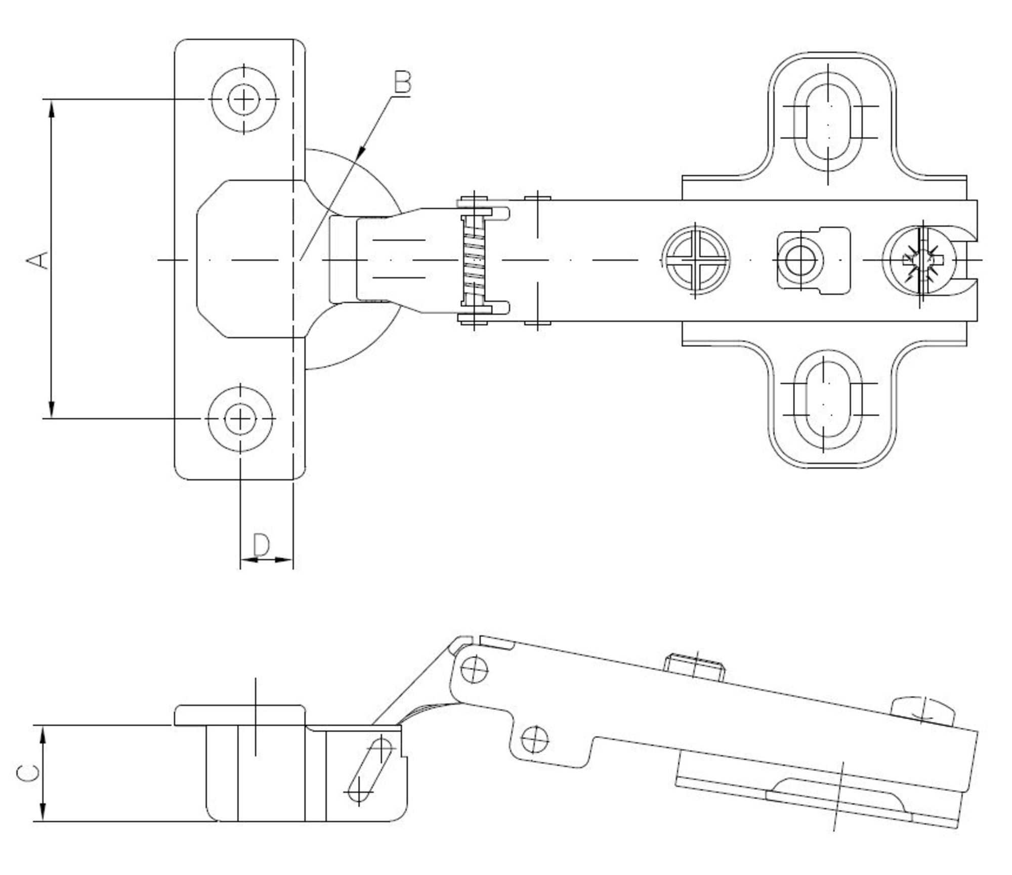 The clip-on hinges should be placed onto the front of the mounting plate. A gentle push on the hinge arm with your finger will result in an audible click, indicating that the hinge is securely fastened to the mounting plate. At this point, the hinge arm is firmly and stably attached to the side of the cabinet.