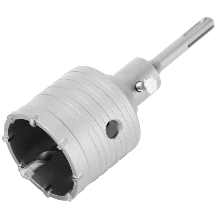 The hole saw, included with a shank, is used as an accessory for SDS PLUS hammer drills. It is designed for drilling in concrete and can be used at home. The hole saw is useful during renovation work for creating openings for pipes, sockets, and switches.