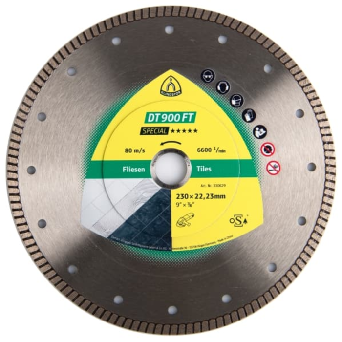 The DT 900 FT Special diamond cutting discs from the 900 range are among the high-performance tools from Klingspor. Excellent cutting performance, maximum aggressiveness and long service life make them the ideal tools for the most difficult tasks. High demands on performance and operational reliability are no problem for this disc – the result is always perfect and convincing. An important quality and performance feature is the closed turbo toothing, which ensures clean cutting edges and precision thanks to high running smoothness. Diamond cutting discs for stoneware, tiles and granite are available in various diameters, so you can choose the perfect disc for every application.