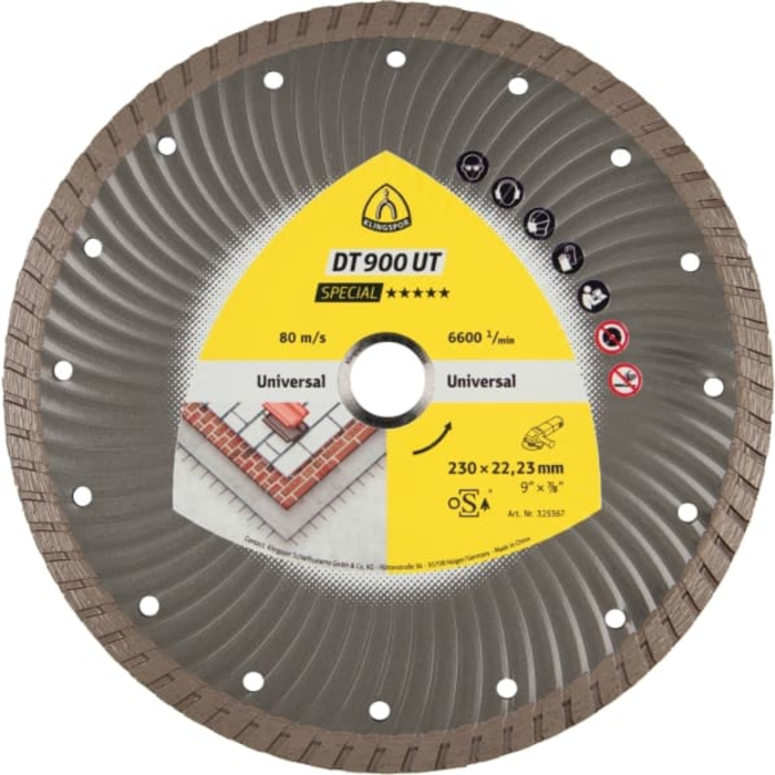 The DT 900 UT Special diamond cutting discs are designed for working speeds of up to 80 m/s. With a disc diameter of 100 mm, the permissible speed is over 15,000 rpm. The wavy disc ensures optimum heat dissipation. The holes in the disc also provide additional cooling. The discs can be used wet or dry. The DT 900 UT Special diamond cutting discs are very aggressive and have an above-average service life. They belong to the 900 product series and are therefore designed for maximum performance: Klingspor guarantees maximum performance and absolute reliability under the most extreme conditions. Of course, the DT 900 UT Special diamond cutting discs meet the requirements of the European safety standard EN 13236 and the strict oSa guidelines.