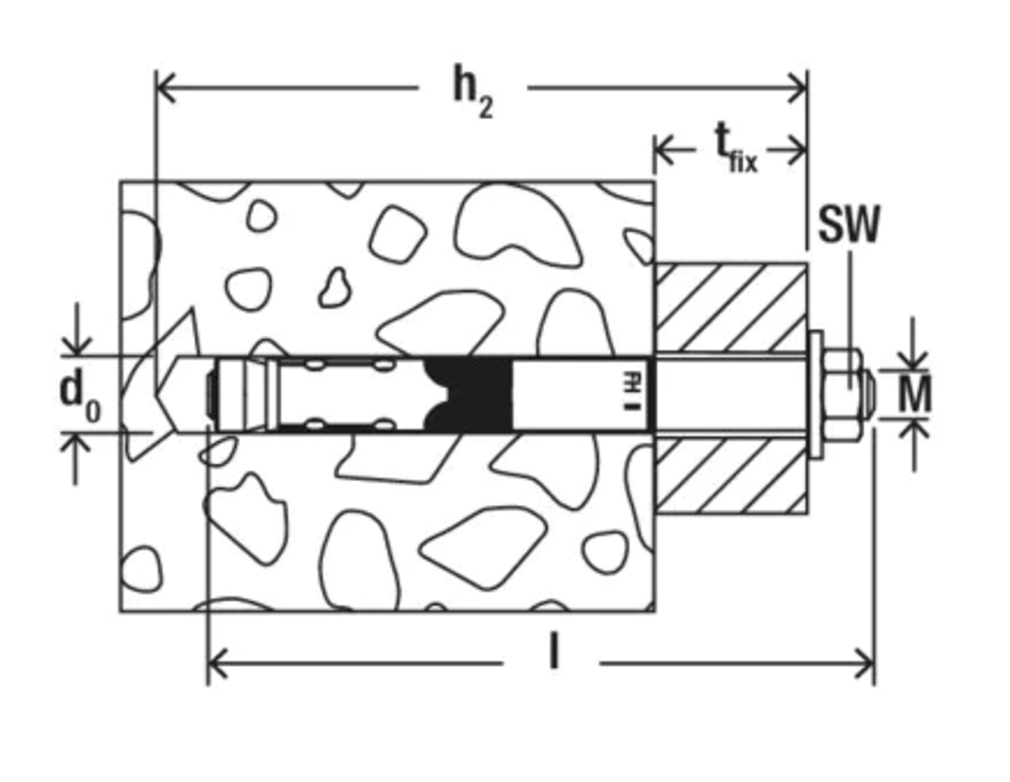 The fischer heavy-duty anchor FH II-B is a sleeve anchor made of galvanized steel. The FH II B is ideal for fastening brackets, steel structures and cable trays in cracked and non-cracked concrete. The European Technical Assessment and classification according to fire resistance class R 120 guarantee additional safety. In addition, the Technical Assessment allows use in seismic zones (cat. C1 and C2). The anchor is sunk flush with the surface, using the push-through installation principle. After tightening the nut, the cone is pulled into the expansion sleeve and expands it against the walls of the hole. This anchors in the base material. The black plastic ring prevents unwanted rotation of the anchor and absorbs torque slippage.