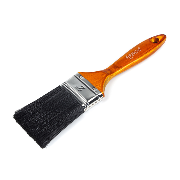 The flat brush "LAKRA" features synthetic bristles that absorb paint well and provide smooth, even coverage. It is ideal for varnishing. However, it is not recommended for use with solvent-based paints and varnishes. The brush has a lightweight plastic handle, and the ferrule is made of stainless steel. The bristles are packaged in an individual durable polyethylene cover, which can be easily removed and protects the bristles from dirt, dust, and mechanical damage. The brush is easy to clean after use and the handle has a hanging hole for convenient storage.