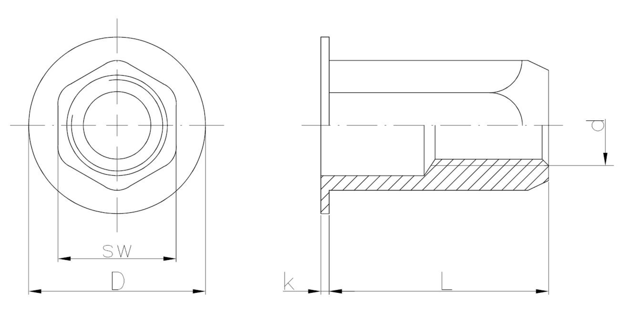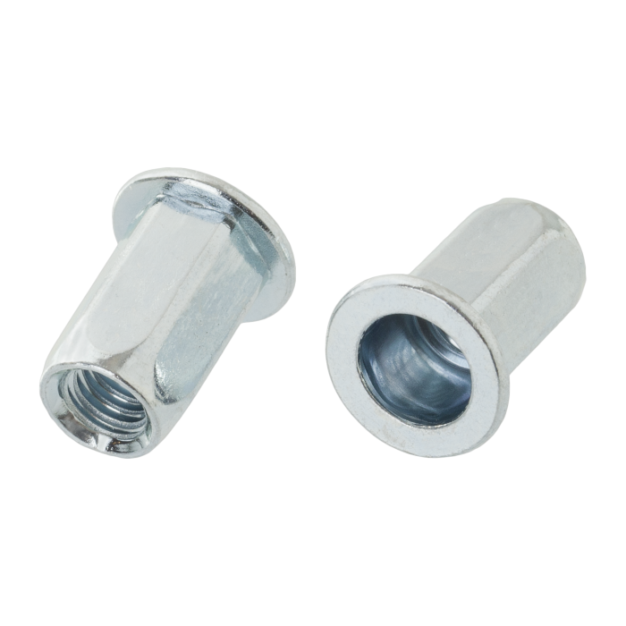 The hexagonal design prevents the installed rivet nut from rotating in the hole.