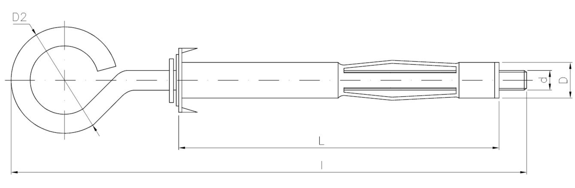 The hollow wall anchor with eye hook is a fastening element with a unique design, intended for secure and durable installation in hollow spaces such as drywall, ceiling tiles, and other soft materials. This product is equipped with eye hooks that allow for the suspension of various loads, making it a versatile tool for various mounting applications.