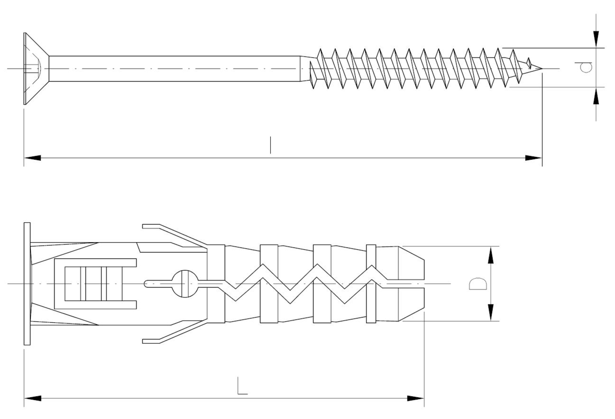 The plastic plug with countersunk head screw is a component used for mounting and securing structures, building materials, or other elements in place. This mechanical solution allows for fastening inside a hole or cavity by expanding the screwed-in countersunk element.