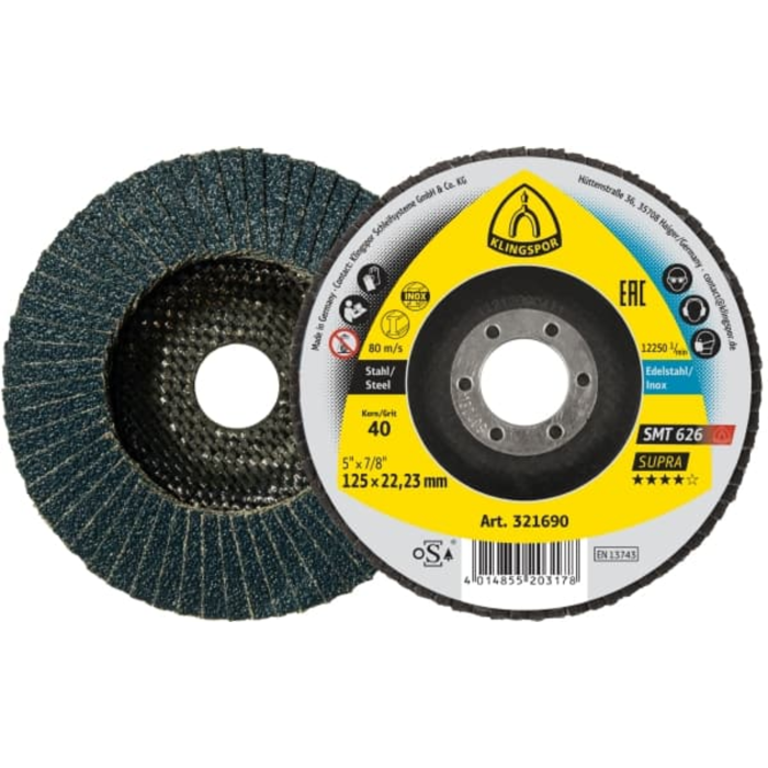 Flap discs such as the SMT 626 Supra combine high machining efficiency with optimum finishing quality. These discs can be used for aggressive grinding of steel and stainless steel and also provide a uniform grinding pattern. The SMT 626 Supra discs enable both chamfering and fast rough grinding. The specific feature of this product is the arrangement of the flaps. They are slightly inclined and therefore have two advantages: They enable a uniform grinding pattern even during aggressive use and have a long service life. Thanks to the special construction of the flaps, the grinding wheel is loaded evenly and does not wear out on just one side. Therefore, even after long-term use, the SMT 626 Supra grinding wheels from Klingspor perform very well.