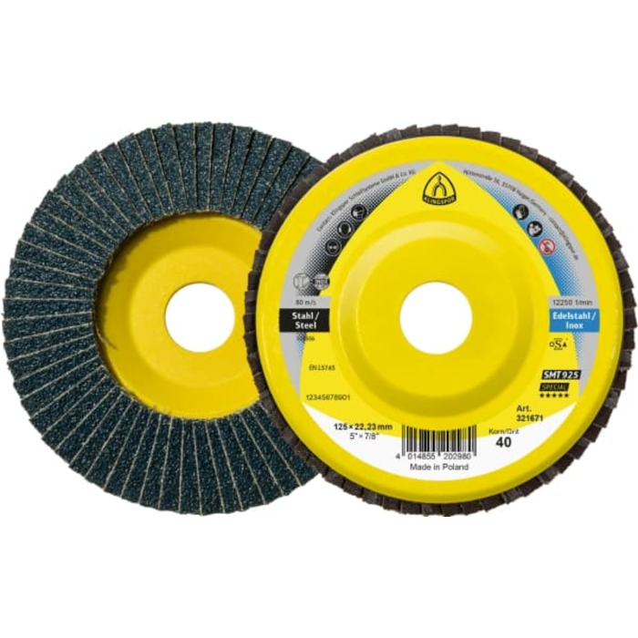 Flap discs from the Special range \ nThis is a flap disc available from Klingspor in straight and convex versions. Convex flap discs grind with their narrower working surface. Because the work is more selective, they achieve a higher grinding performance per unit of time. This is the ideal solution for processing edges and welds. The straight versions, on the other hand, use the entire surface and are suitable for frontal grinding and surface grinding. In the Special series, Klingspor offers the right grinding disc for every application. These are high-performance products for use in industrial and craft enterprises, ensuring maximum performance and service life even under continuous load. Therefore, the SMT 925 Special flap disc grinding wheels are a reliable abrasive material with a wide range of applications.