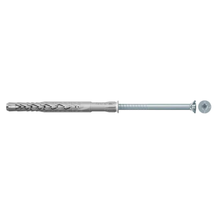 The SXRL-T frame plug with a countersunk screw and a TX40 socket is designed for multi-point fixing of non-load-bearing structures in masonry, concrete and aerated concrete. Two expansion zones allow for even load distribution, whether in hollow blocks or aerated concrete or in solid building materials. The frame fixing, containing a stainless steel safety screw, is suitable for fixing elements such as windows, coat racks, hanging cabinets or TV consoles inside buildings.