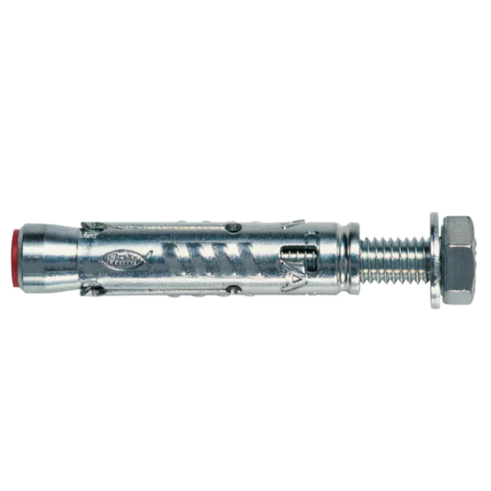 The fischer TA M heavy-duty anchor with internal thread is made of galvanised steel and is designed for pre-installation. During installation, the cone is pulled into the expansion sleeve, which presses it against the walls of the hole. The plastic cap prevents thread contamination, which ensures good function. The heavy-duty anchor is suitable for securing impact protection barriers and machines in non-cracked concrete.