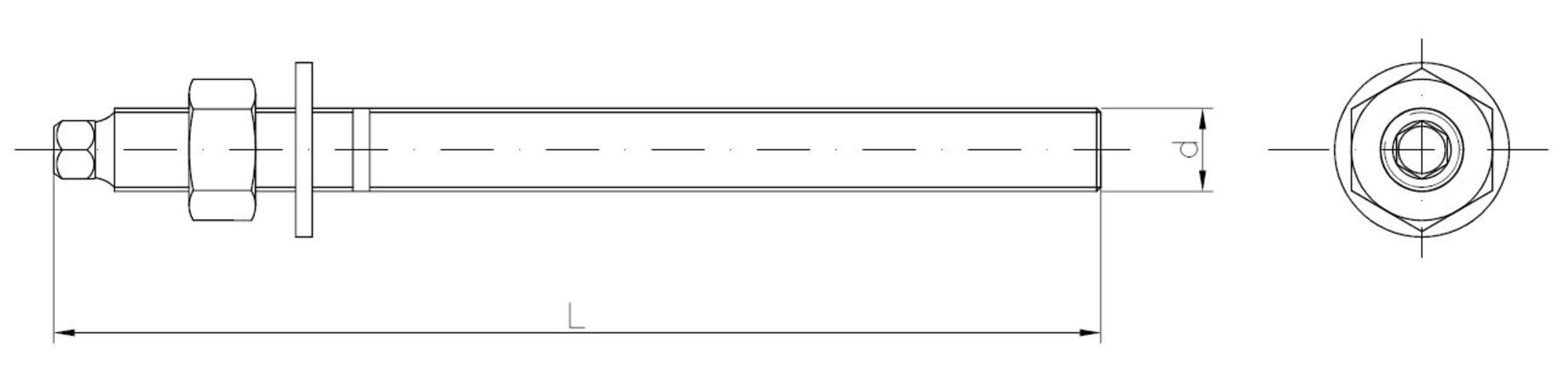 Threaded anchors for chemical anchoring are delivered with a coarse round washer and a hexagonal nut in standard sizes.