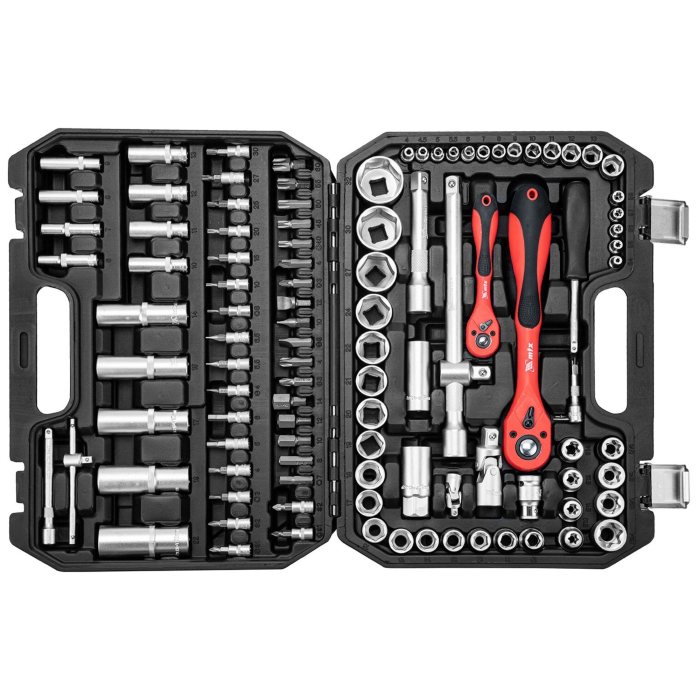 The MTX 135119 toolset with 1/2" and 1/4" connection dimensions consists of 108 CrV steel elements, designed for assembling and disassembling various threaded fasteners with different types of ends. The set includes joints, extensions, and adapters to facilitate working in hard-to-reach places. The set is used for car repairs and is useful around the house.